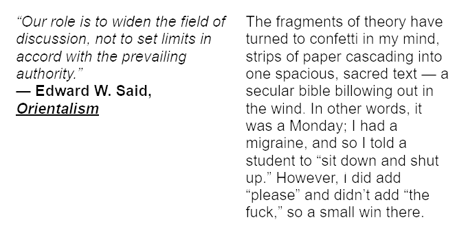 Another chapter, “Teacher, Don’t Teach Me Nonsense,” takes up the theory–practice learning model. On the left side of the page are a series of direct quotations from decolonial scholars, philosophers, and educators such as Paulo Freire, Ngũgĩ Wa Thiongo’o, Gayatri Spivak, bell hooks, Edward Said, and Beverly Daniel Tatum. On the right side, Enfield writes the theory into practice, letting the reader draw the connections between the theory and the practice.